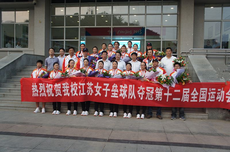 校江苏女垒全体队员、教练员、领队等一行一抵学校就得到了学校领导和列队同学最为热烈的迎接,校老员工乐队吹起了欢快动听的乐曲,学校领导与他们一一握手,校员工代表为凯旋而归的运动员、教练员等献上鲜花,对她们胜利而归,表示衷心祝贺!