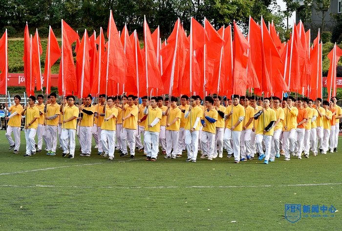 上午8:30分,副董事长崔益虎主持并宣布开幕式正式开始,校鲜花队手捧美丽鲜艳的花朵,红旗队挥舞着鲜红的旗帜,向主席台走来。随后,各学部、学院和各直属单位组成的运动员代表队伴随着优美乐曲依次入场。随后,举行了升国旗和校旗仪式。