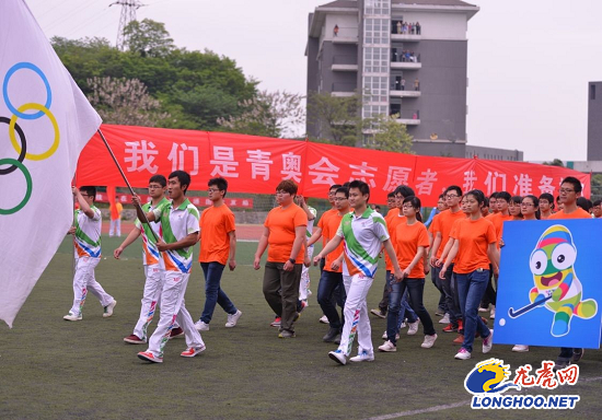 运动会以“青春激扬律动南工 挥洒才智致敬青奥”为主题,在开幕式上一个身着橙色衣服的志愿者方队吸引了众人的目光,他们手握拳头,高声宣誓:“挥洒汗水、奉献青春”。