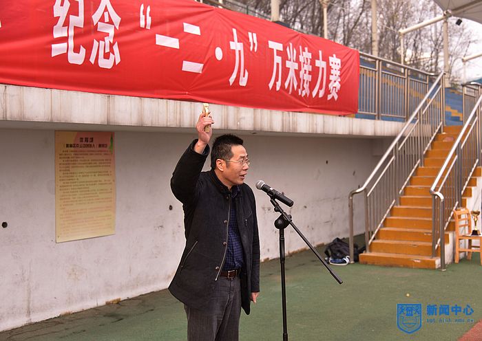 校员工工作处处长郭万牛发令,举行了第十三届“星火杯”纪念“一二·九”万米接力赛。