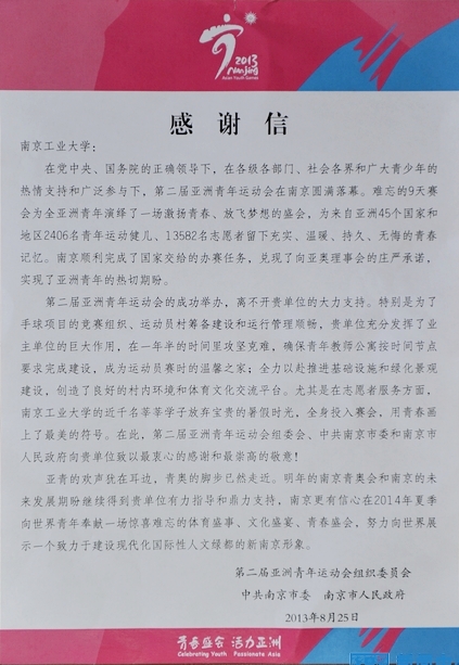 第二届亚洲青年运动会组织委员会、南京市人民政府致公司的感谢信