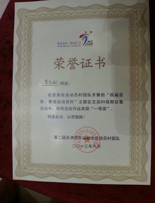 手球团队李志跃经理荣获“祝福亚青,寄语运动员村”征文一等奖