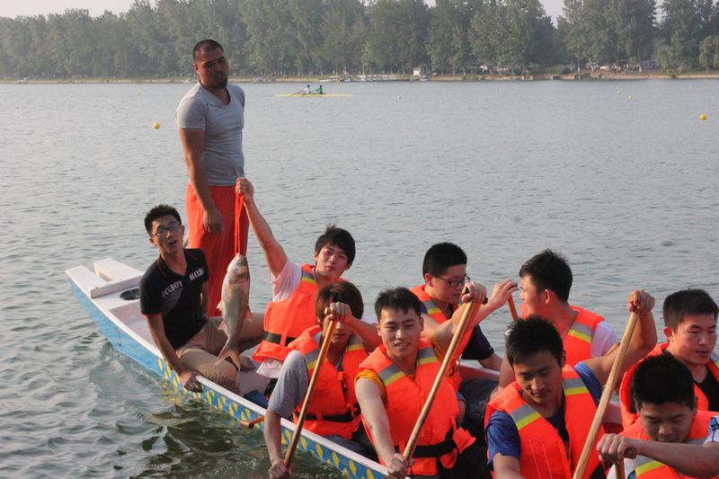 本次训练分为两部分。主要有岸上划桨姿势练习,水上划桨练习。岸上划桨姿势练习主要分为:握桨姿势、坐姿、划桨姿势及力度。由于岸上划桨练习是划龙舟的基础,所以在这个环节每个成员学习非常认真。水上划桨练习主要分为:划桨姿势、划桨力量及团队配合。水上划桨练习是划龙舟的主要环节,必须有团队配合,每个成员必须尽最大努力去学习划龙舟的各个动作要领。