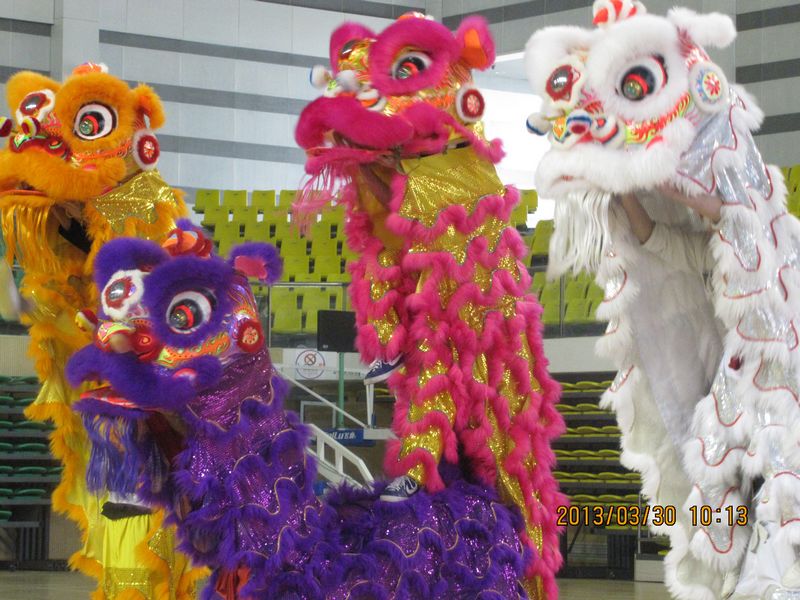 中场休息时,校舞狮队为观众带来精彩表演。四只勇猛的狮子眨着眼睛,晃着脑袋走上了台,其颜色各异,很是喜庆。四只狮子踏着鼓乐声时起时落,摇摆跳跃,神态丰富,把狮子演得活灵活现。其中白狮还表演了跃高台。其庞大的身躯灵活敏捷,一跃而起,踏上高台,在高台上直身而立,昂首挺胸,赫赫生威,大有居高临下睥睨群雄的王者风范,带给观众巨大的视觉享受。