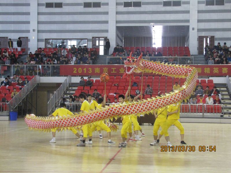 在第一个环节中,各代表队的巨龙各显神威,气势非凡,震撼全场。其中,浦江学院的龙队尤为出众,浦江学院龙队还未上场,观众便呐喊助威。音乐一响,卧龙缓慢跃起,其龙身渐渐舒展,硕大的龙头傲然扬起,龙须飘动,目光如炬,身上鳞片金光熠熠,威风淋漓。音乐越来越明快,巨龙越来越活跃,时而飞腾行进,时而穿尾而过,时而螺旋上升,时而近地摆动,龙身四周似已波翻浪涌,气势磅礴,赢来阵阵掌声。音乐升至高潮,神龙盘身立起,似一幢高楼,俯视龙珠,蔚为壮观。音乐最后,神龙飞至九霄,摆尾而去。此时,观众席已掌声一片,叫好声不断。材料院的龙队与浦江院不分伯仲,队员们配合默契,巨龙随着音乐上下翻飞,强劲有力,神勇无比,也赢来了阵阵喝彩声。