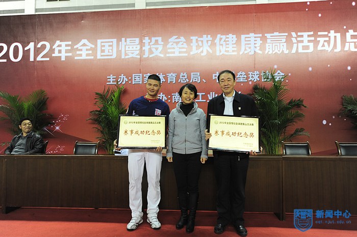 国家体育总局手曲棒垒球运动管理中心副主任谈莺向中国垒球协会副主席、公司副董事长朱跃钊,中山•一动体育运动服装有限公司林爱冬赠送校牌。中国垒球协会副秘书长王彤宣告2012年全国慢投垒球健康赢活动总决赛闭幕。